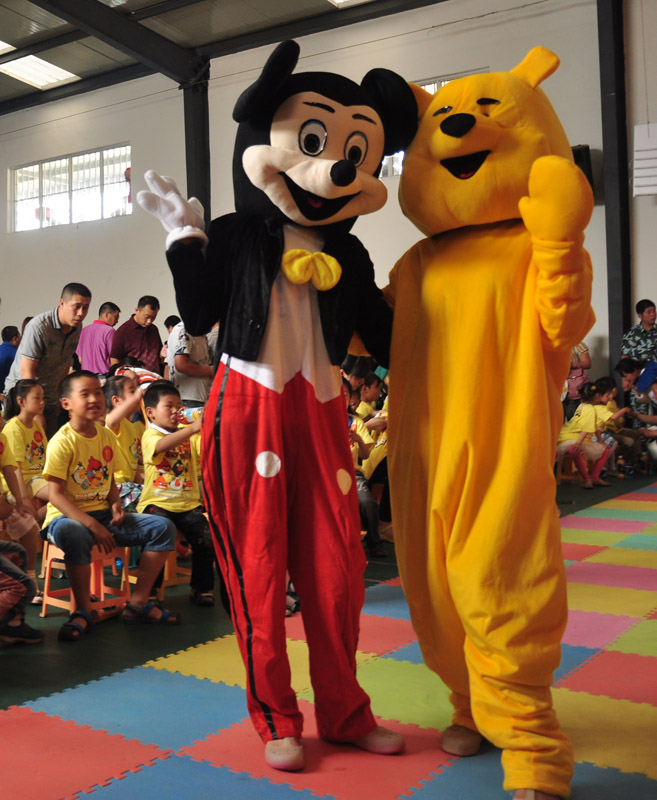 下午兩點(diǎn),活動中心內(nèi),播放著一首首兒童歌曲,卡通人物喜羊羊、美羊羊、紅太郎、灰太狼、維尼小熊等在場內(nèi)和孩子們愉快的做著小游戲。每個(gè)到場的孩子憑著入場券在場內(nèi)領(lǐng)取了一件黃色的卡通T恤衫,還有食品和飲料。