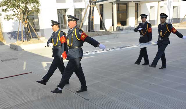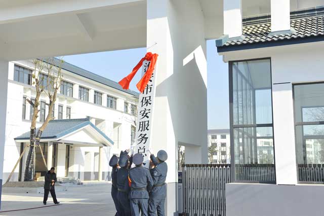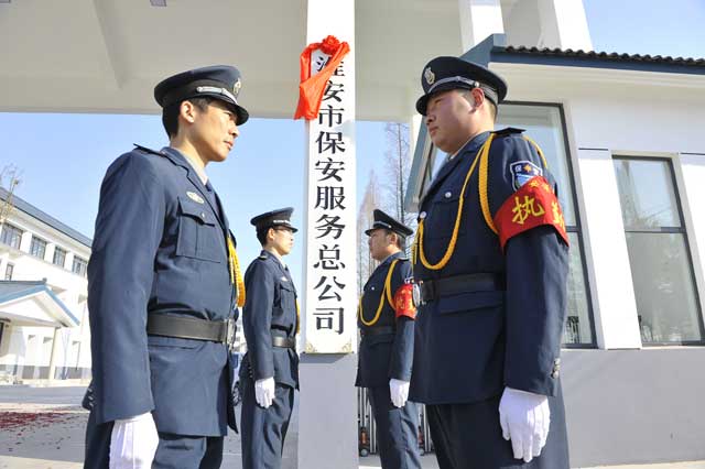 雖然室外氣溫格外寒冷,但這里卻充滿了春天的氣息。上午9時(shí)50分,4名禮儀保安抬著一塊披著紅綢的標(biāo)牌, 邁著整齊的步伐走向公司大門,9時(shí)58分,江蘇省淮安市保安服務(wù)總公司標(biāo)牌緩緩地、平穩(wěn)地掛了起來(lái),現(xiàn)場(chǎng)響起陣陣鞭炮聲和熱烈的掌聲,大家共同為總公司新址掛牌而歡欣鼓舞。
