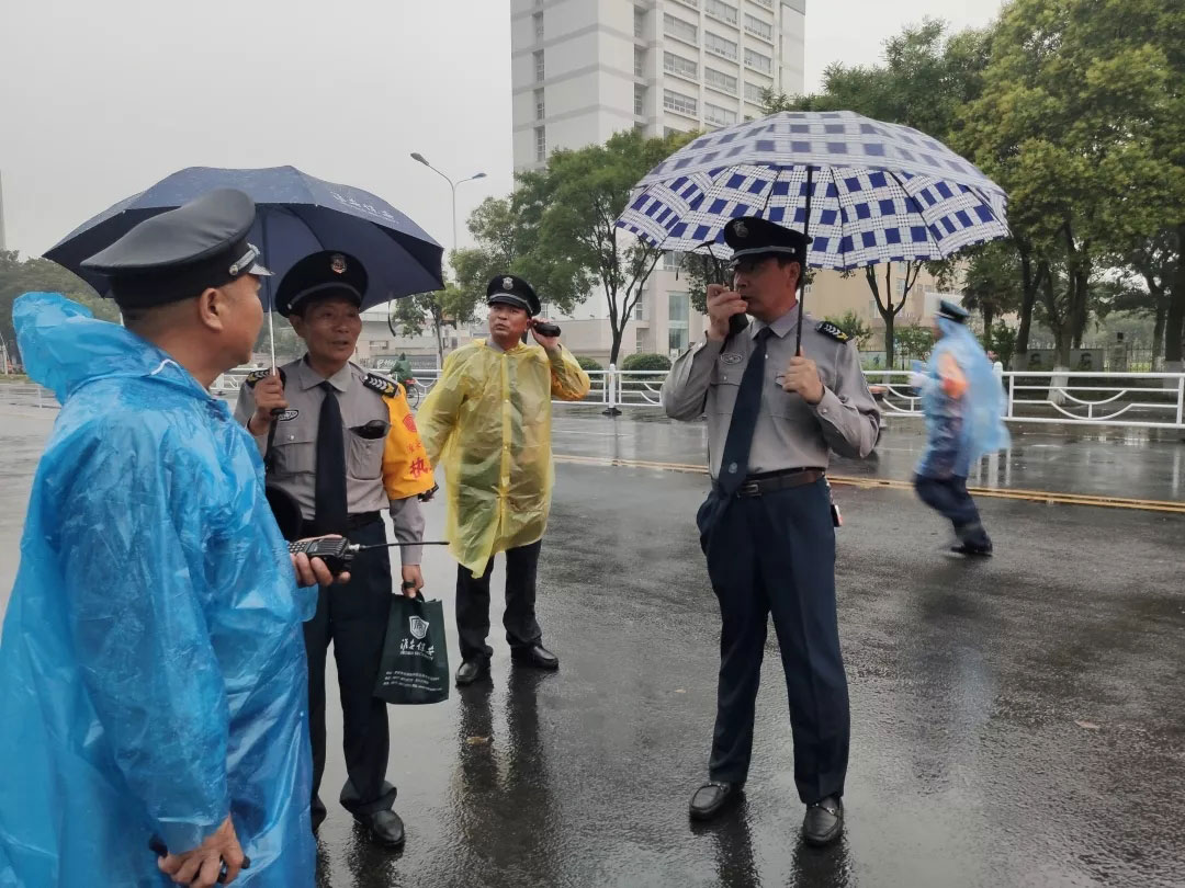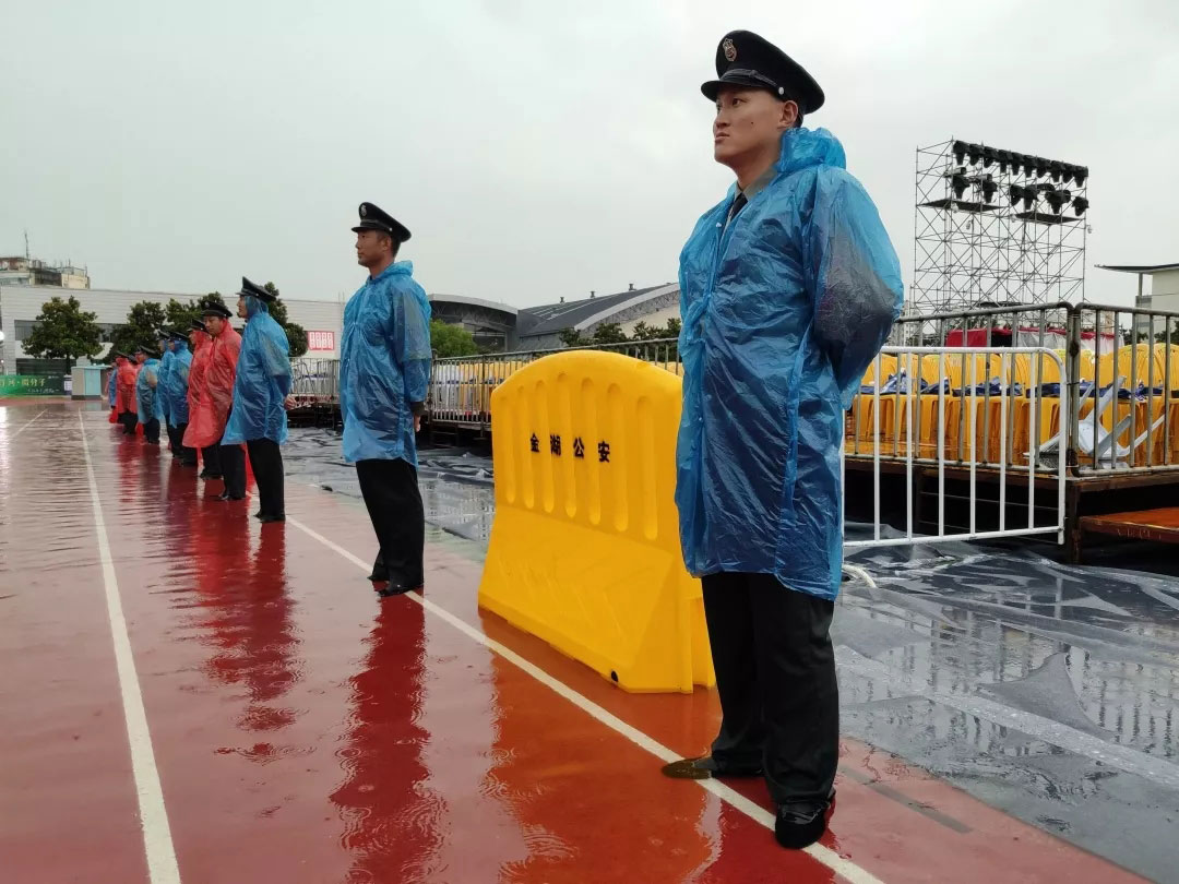 7月6日下午15點,晚會現(xiàn)場暴雨來臨,降雨量已超100毫米,雨勢持續(xù),并伴有雷暴天氣。由于惡劣天氣影響,加上持續(xù)暴雨,部分道路積水嚴重,給觀眾入場帶來安全隱患??偣玖⒓磫訛暮μ鞖鈶鳖A案,行政部門迅速出動,發(fā)放雨衣。人防管理中心組織全體保安隊員,在重要路口指揮疏導,采取定人、定崗、定責的預防措施,全體保安隊員在暴雨中堅守崗位,認真做好崗位工作。