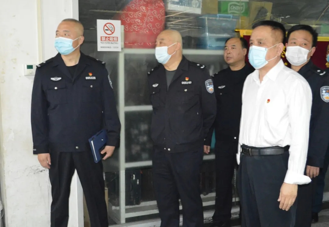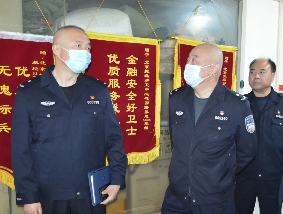 4月28日,北京市公安局內(nèi)部單位保衛(wèi)局副局長魏民在北京振遠(yuǎn)護(hù)衛(wèi)中心總經(jīng)理?xiàng)钚缕健⒈本╅_遠(yuǎn)保安公司經(jīng)理劉伯元、文安保安公司經(jīng)理郝宗芬的陪同下,來到振遠(yuǎn)第十二支隊(duì)花園路基地檢查指導(dǎo)疫情防控工作,并看望慰問基地一線押運(yùn)隊(duì)員。