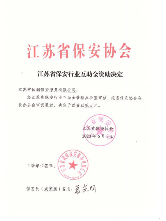 2019年5月,江蘇省保安協(xié)會針對保安行業(yè)工資待遇低、素質(zhì)能力低、社會地位低、流失率高“三低一高”現(xiàn)象,通過探索建立最低用工成本制度、開展保安服務(wù)公司等級評定、組織全省保安職業(yè)技能競賽等措施改善保安行業(yè)營商環(huán)境、提升保安隊(duì)員素質(zhì)能力、樹立保安隊(duì)伍良好形象的同時(shí),借鑒提煉企業(yè)經(jīng)驗(yàn)做法并經(jīng)反復(fù)調(diào)研論證,制定出臺了《江蘇省保安行業(yè)互助金管理辦法(試行)》和《江蘇省保安行業(yè)互助金管理細(xì)則(試行)》,堅(jiān)持自愿、平等、互惠原則,采取保安企業(yè)出資、保安隊(duì)員受益方式,對因工傷亡、大病特困保安隊(duì)員進(jìn)行撫恤資助。2020年1月10日互助金繳存資助工作啟動以來,已有232家保安服務(wù)公司自愿加入互助單位、在職保安隊(duì)員13萬余人。除江蘇常誠潤保安服務(wù)有限公司保安員葛光明外,還有13家保安服務(wù)公司為15名保安員提出資助申請,相關(guān)審核工作正在有序推進(jìn)。