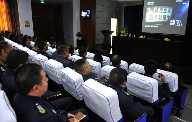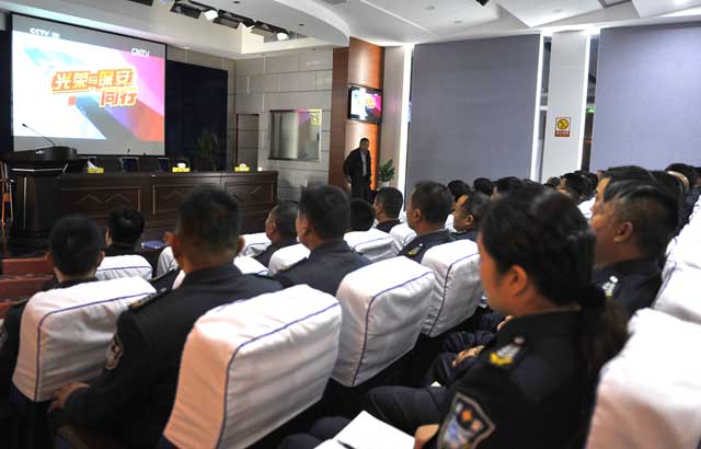 2014年10月27日上午,總公司周一早例會(huì)結(jié)束后,與會(huì)人員在報(bào)告廳一起觀(guān)看了《光榮與保安同行》電視專(zhuān)題片。