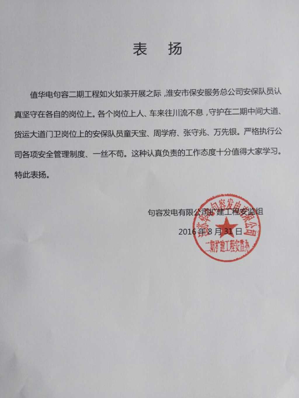 2016年8月31日,淮安保安駐外分公司收到江蘇華電句容發(fā)電有限公司發(fā)來的表揚(yáng)信。表揚(yáng)淮安保安駐句容執(zhí)勤點(diǎn)的四名保安隊(duì)員童天保、周學(xué)府、張守兆、萬先銀認(rèn)真堅(jiān)守各自崗位、嚴(yán)格執(zhí)行服務(wù)單位各項(xiàng)安全管理的行為。