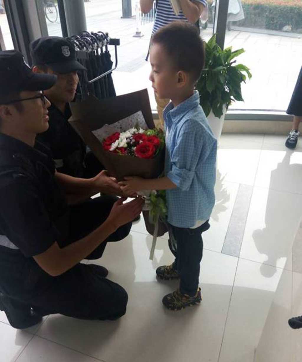 2016年10月5日下午在萬達(dá)廣場(chǎng)警務(wù)工作服務(wù)站內(nèi),在淮安日?qǐng)?bào)社、淮安電視臺(tái)等記者的“咔咔”攝像聲中,談亦童小朋友手捧鮮花來到隊(duì)員胡繼田與孫慧棟兩名隊(duì)員面前,連聲說“謝謝叔叔!謝謝叔叔!”原來是10月4號(hào)晚8時(shí)左右,隊(duì)員胡繼田與孫慧棟一組正常巡邏到A區(qū)域時(shí),發(fā)現(xiàn)車庫(kù)處,一女同志懷抱一小孩,吃力地往前跑,邊跑邊哭。這時(shí)巡邏隊(duì)員發(fā)現(xiàn),立即沖上前,問明情況后,抱過小孩直奔附近中山醫(yī)院,沒有找值班醫(yī)生,后立馬往八二醫(yī)院跑。聞?dòng)嵹s來的巡邏車,帶上他們一同趕往八二醫(yī)院。在路途中孩子的媽媽童女士,急的失聲痛哭。原來童女士帶著孩子逛商城時(shí),孩子吃了牛皮糖不小心堵住氣管,孩子一度臉色蒼白,痛苦的呻吟。在往醫(yī)院奔趕得途中,由于顛簸,將牛皮糖顛下去了。到八二醫(yī)院,醫(yī)生檢查后確認(rèn)化險(xiǎn)為夷。醫(yī)生說如果不是保安及時(shí)處置,孩子很可能就窒息了,十分危險(xiǎn)。于是出現(xiàn)開頭的一幕。萬達(dá)警務(wù)工作服務(wù)站是淮安市公安局剛剛組建的新的惠民服務(wù),總公司派駐的50名輔警人員。自9月24日組建以來,傳承了淮安保安隊(duì)伍優(yōu)良品德,嚴(yán)謹(jǐn)?shù)墓ぷ髯黠L(fēng),過硬的素質(zhì),得到清河公安分局領(lǐng)導(dǎo)的高度贊揚(yáng),得到社會(huì)廣泛認(rèn)可!引起淮安電視臺(tái)以及淮安日?qǐng)?bào)等媒體的關(guān)注和贊美!