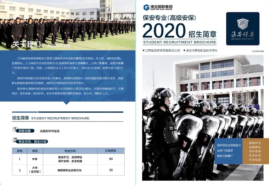 本屆高級(jí)安保專業(yè),在原有三年制中專班基礎(chǔ)之上,新增了五年制“物聯(lián)網(wǎng)方向高級(jí)安?!贝髮0?。公司黨總支書記、總經(jīng)理趙愛忠對專業(yè)招生工作高度重視,多次強(qiáng)調(diào)招生工作的重要性。公司制定了詳細(xì)的招生宣傳工作方案,精心制作了招生宣傳手冊、招生宣傳片,通過中國保安微信號(hào)、淮安公安微警務(wù)、保安總公司微信號(hào)、抖音號(hào)等媒介加強(qiáng)招生宣傳,公司人防中心、押運(yùn)中心等部門組織招生工作小組深入?yún)^(qū)縣中學(xué)畢業(yè)班宣講,吸引了大批考生踴躍報(bào)考。